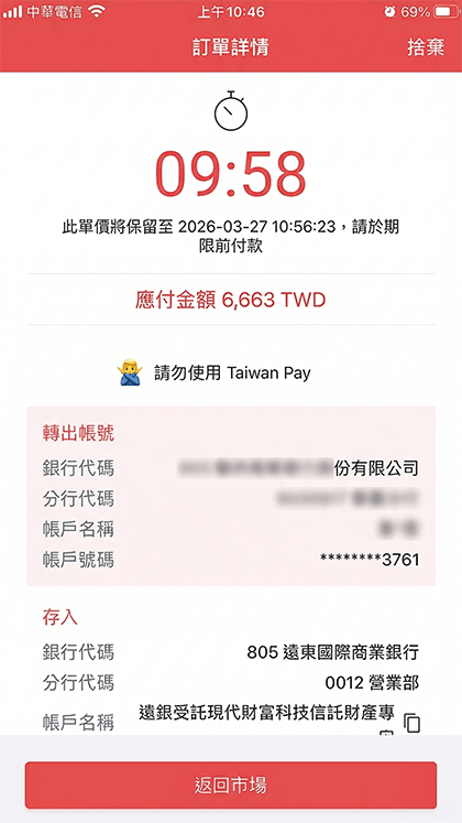 使用台灣網路銀行或 ATM 機轉帳時,請務必在 10 分鐘內完成