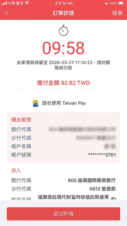 使用台灣網路銀行或 ATM 機轉帳時,請務必在 10 分鐘內完成