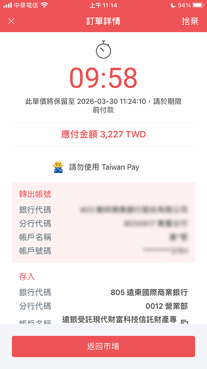 使用台灣網路銀行或 ATM 機轉帳時,請務必在 10 分鐘內完成